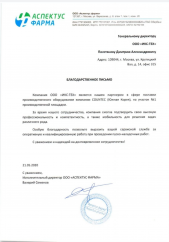 Мы получили благодарственное письмо от Исполнительного директора ООО “Аспектус фарма”, в котором была особо отмечена работа нашей сервисной службы.